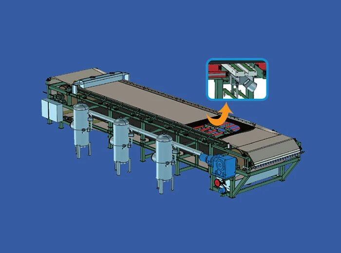 帶式真空過濾機(jī)是一種自動(dòng)化程度較高的新型固液分離設(shè)備,該設(shè)備由機(jī)架、真空箱、驅(qū)動(dòng)輥、壓布輥、糾偏輥、展布輥、料漿分布器、濾布糾偏裝置、濾布再生裝置和傳動(dòng)裝置、濾布等部件組成,是充分利用物料重力和真空吸力實(shí)現(xiàn)固液分離的高效分離設(shè)備。