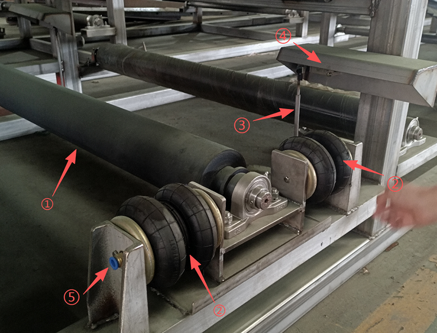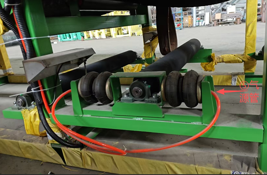 在正常運轉(zhuǎn)中,濾布是不會碰到糾偏裝置的檢測桿。當濾布跑偏時,濾布會碰到檢測桿,檢測桿偏移,自動糾偏裝置中的氣囊會一側(cè)充氣,一側(cè)放氣,帶動糾偏輥蛇形偏移,使濾布改變偏移方向,恢復到正常運轉(zhuǎn)軌跡。