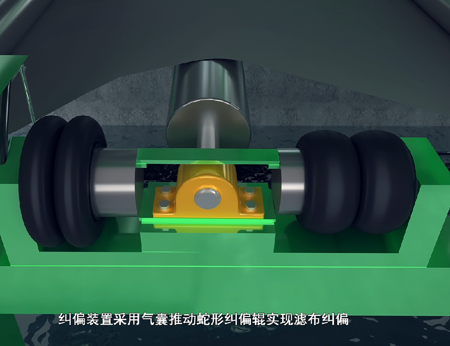 濾布在運轉(zhuǎn)過程中可能會出現(xiàn)跑偏的現(xiàn)象,利用濾布糾偏裝置糾正濾布偏移方向,使濾布處于正常工作狀態(tài)。