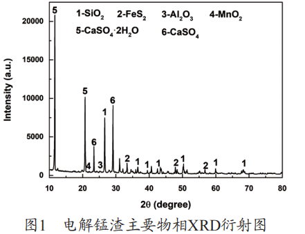 電解錳渣為粉末狀固體廢棄物,其為黑色細小顆粒,水分含量較多,平均含水量在30% 左右。本文對所選貴州地區(qū)電解錳渣中化學成分進行分析測試,發(fā)現(xiàn)其主要元素組成為 O、P、K、Ca、Mg、S、Si、Mn、Fe、Na、Al 等,元素分析見表1。電解錳渣化學組成及含量見表2。圖1為所選電解錳渣 XRD 檢測結(jié)果,得出該電解錳渣的主要成分,含有的主要物相為石英(SiO2)、黃鐵礦(FeS2)、硫酸鈣(CaSO4)、生石膏(CaSO4· 2H2O)、氧化鋁以及氧化錳等。