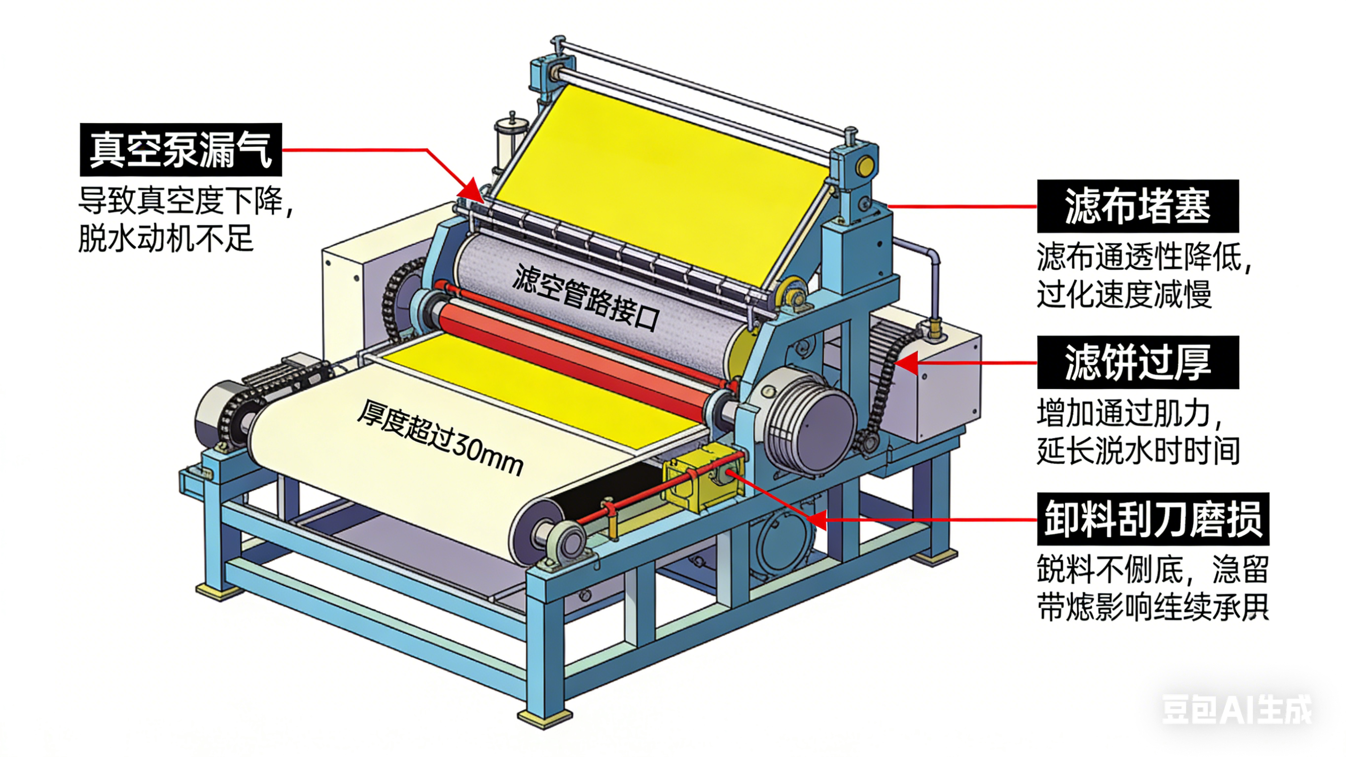此外,濾餅厚度過厚(超過 25–30mm),真空吸力難以穿透濾餅深層,會出現 “表層干、內層濕” 的情況。
